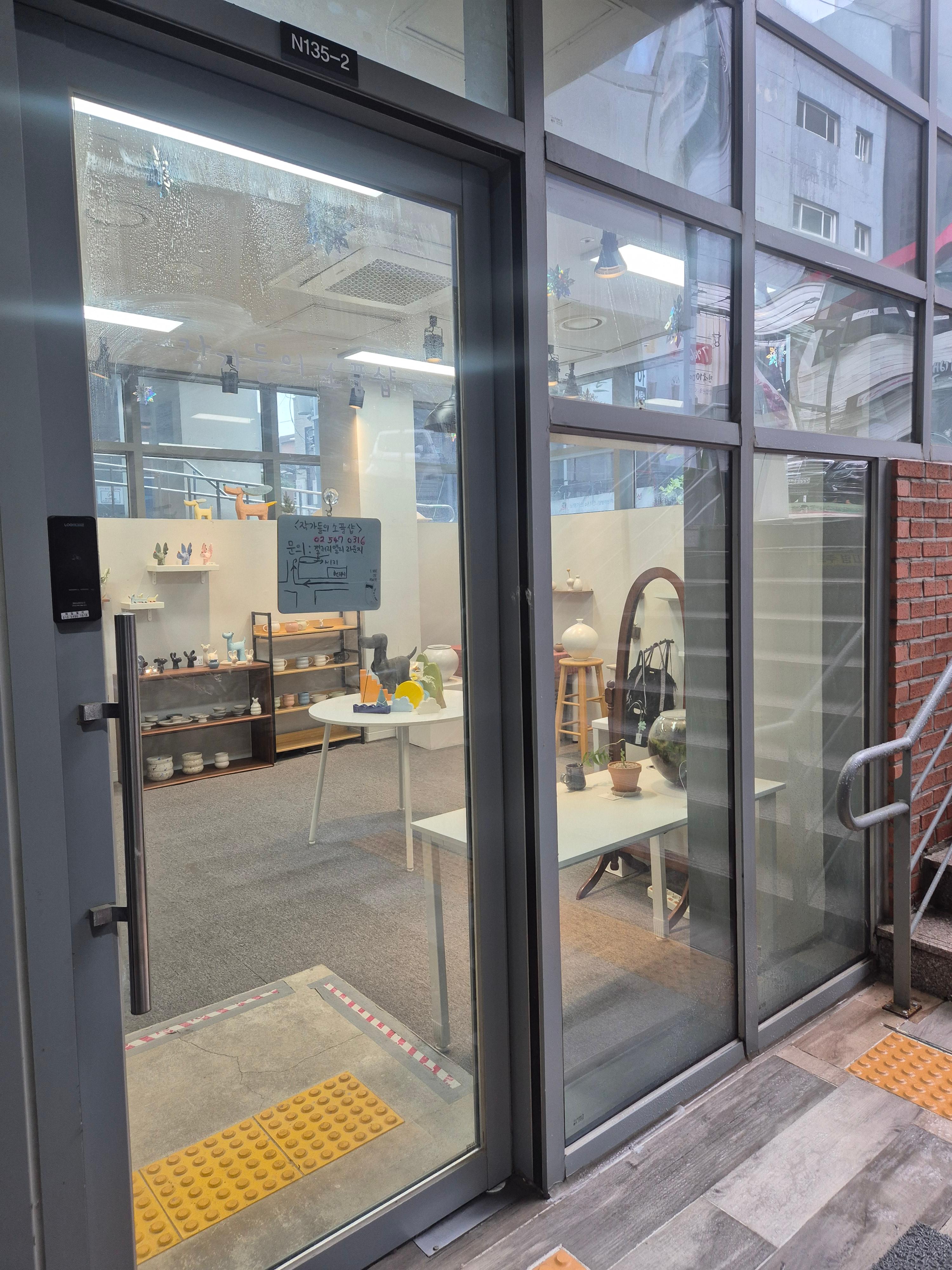입구 유리창 너머로 보이는 작품과 따뜻한 조명이 발걸음을 멈추게 합니다.