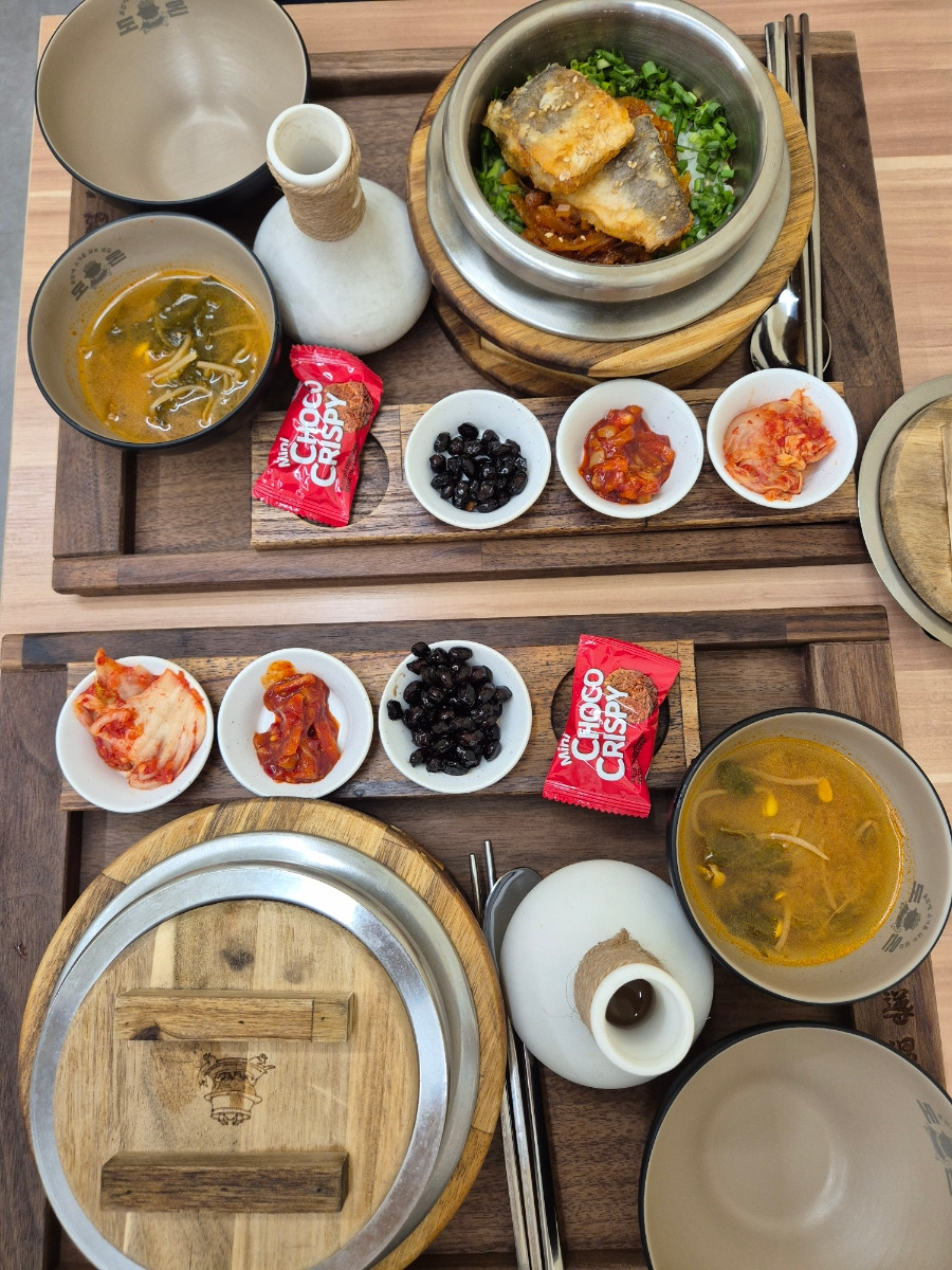 - 반찬은 김치, 콩자반, 장아찌, 무말랭이까지 정갈하게 한 상 차려집니다.